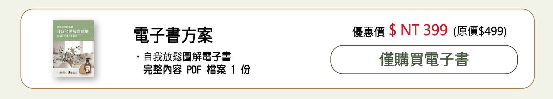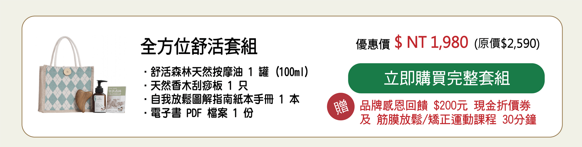 包含舒活森林天然按摩油 1 罐 (100ml)、天然香木刮痧板 1 只、自我放鬆圖解指南紙本手冊 1 本、電子書PDF檔案 1 份